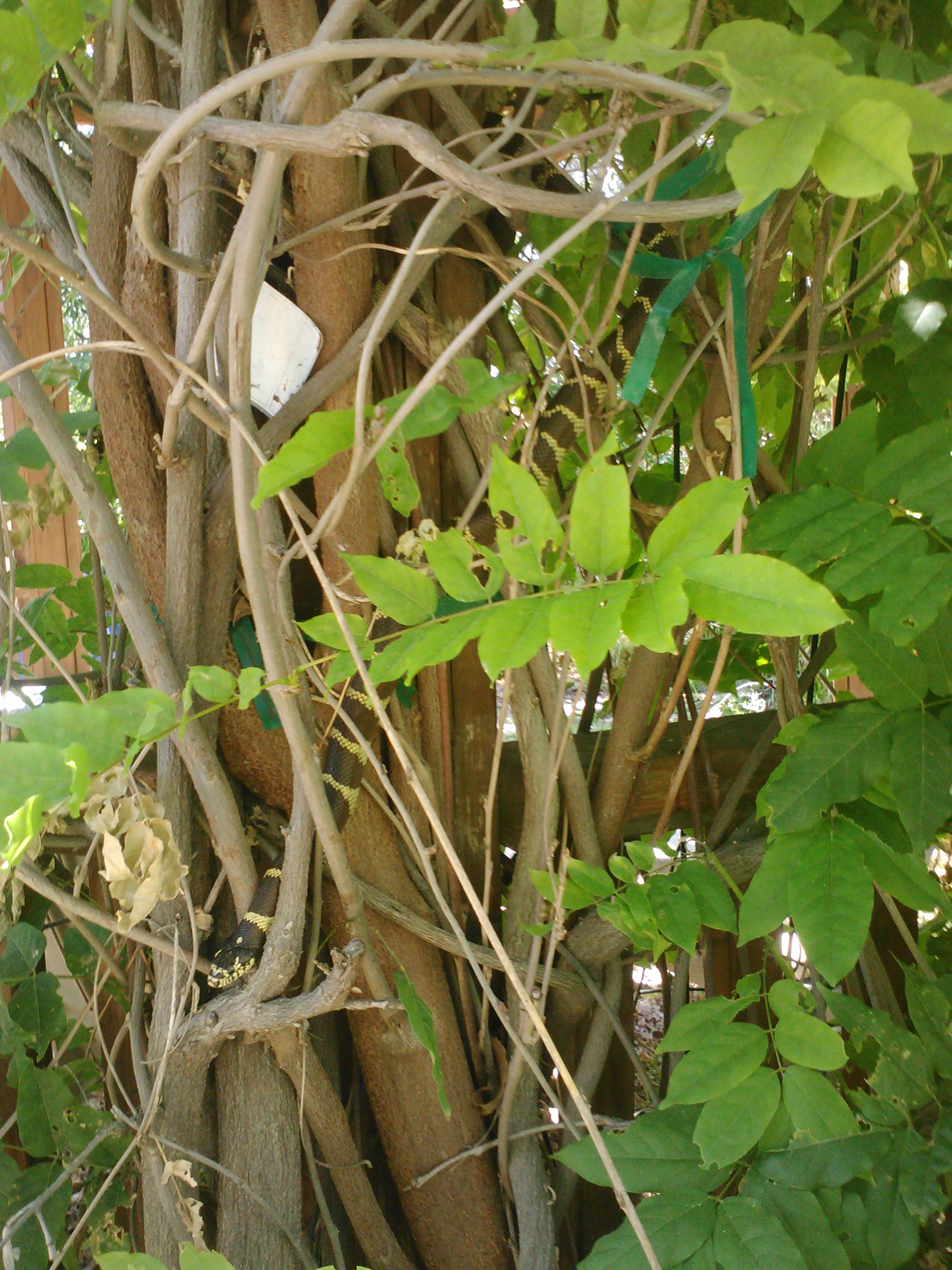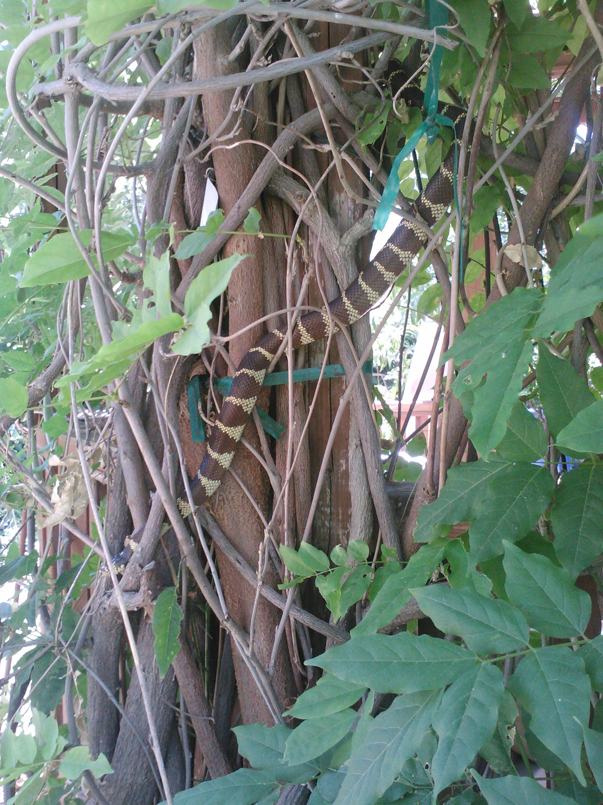 “What? Where?” I asked her. SNAKE, SNAKE, SNAKE!! She repeated back to me. I looked at my feet, and back up to the scrub jay, “I can’t see it. Where is it?” I looked at her bewildered and a bit nervous. I’m quite sure she understood that I wasn’t understanding … so she flew right in front of my face to land on branch that was ostensibly behind me. HERE! SNAKE! SNAKE!! SNAKE!!! She yelled. As she placed her beak no less than three inches from the three foot California King Snake that was slowly winding her way up the vine covered vertical support.